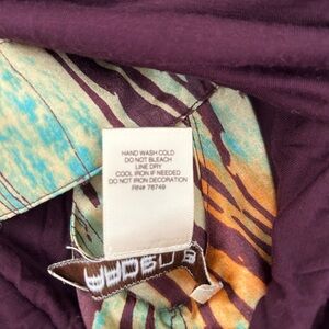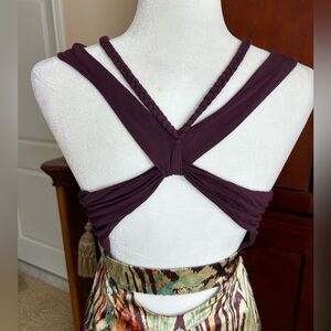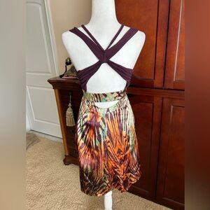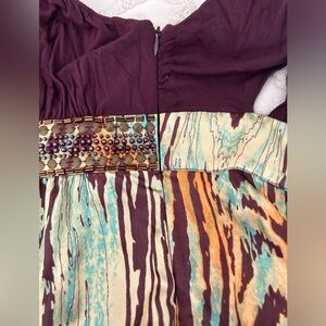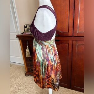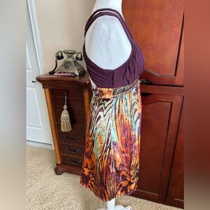 Darling Arden B dress with fun details in rich eggplant, orange, rust, champagne and mint tiger stripes. Ruching at bust, braided strappy detail, cute back, beaded band under bust, side zip, fully lined.