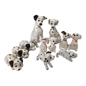 This rare vintage set of 11 figurines from Walt Disney's 1960s 101 Dalmatians is a must-have for any Disney collector. Some are Made in Japan by Enesco, each figurine stands at various heights and features the beloved characters and story theme of the classic Disney movie. This set is a true gem for any fan of the film and is sure to make a great addition to any collection. Don't miss out on the chance to own this rare and unique piece of Disney history.