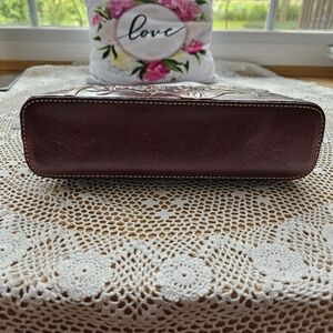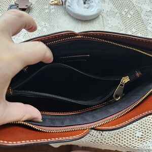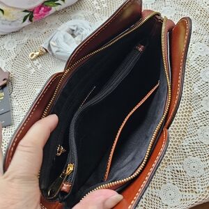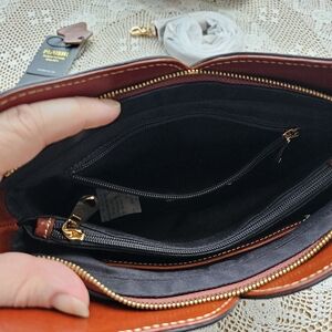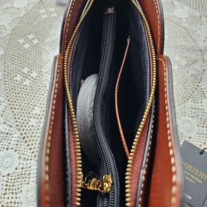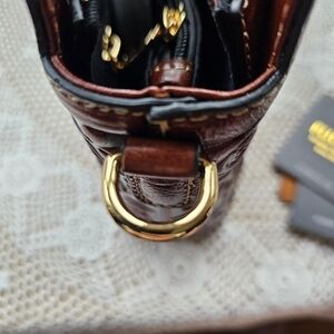AJUSTABLE STRAP. GOLD TONE HARDWARE. BROWN IN COLOR