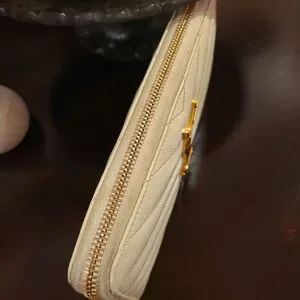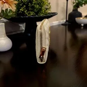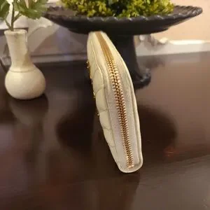 Just marked it down! On sale!! ππππΎ Ivory, cream, off-white beautiful wallet. Leather with gold hardware. Hardware shows wear, scratching! ZOOM. This is a used item. There is wear to corners as well, and wear overall. Wear can include indents, creasing, etc. Interior is clean with signs of wear. This wallet was touched up on corners and cleaned up professionally. There is show of use on material around zipper.