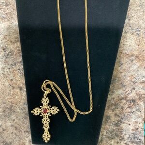 Avon Abbey Cross From 1975  has Ruby Red Cabochon in center.   Made of gold plated metal, with  spring ring closure.  When the chain is doubled it is 16 inches long but whole length of chain is 32 inches.    The cross is 3 inches long and across cross is 2 inches    Excellent condition.  Comes from smoke free home.