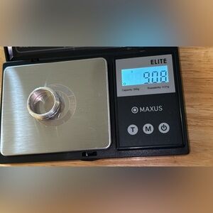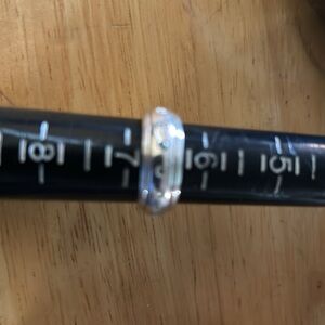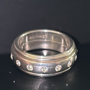 Solid sterling silver, marked and tested. With cubic zirconias all the way around. Width: 7.64mm, 9.08 grams, size 6.5. This is not sizable. Unisex ring. This would make a very cool thumb ring, or a midi ring… and when you get bored, you can just spin it. :)