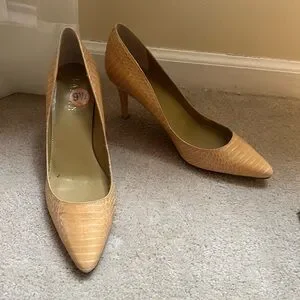3”-3.5” heel. Exterior shoe no flaws. Interior peeling of lining. See pics. Never worn just tried on. Golden tan color.