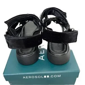 Elevate your style with these stunning Aerosoles Onda black velvet chunky sandals, perfect for any occasion. These sandals feature a strappy design with a low heel height of 1.5 inches, providing comfort and style all day long. The velcro closure ensures a secure fit, while the upper material is made of high-quality velvet.