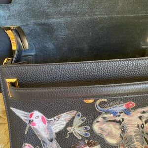 Euc-like new no major callout at all. Comes with dust bag. Black pebbled, leather with gorgeous detailed embroidered animals and gold hardware. Has a cross body strap snap closure.