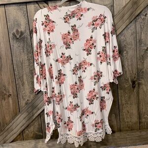 Chic floral cardigan by Charlotte Russe. Features pink flowers on a white background. Delicate lace trim adds elegance. Perfect for layering.