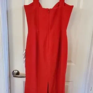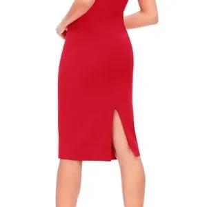 This sleek midi dress features an elegant square back and a fitted silhouette.