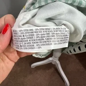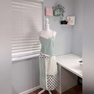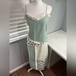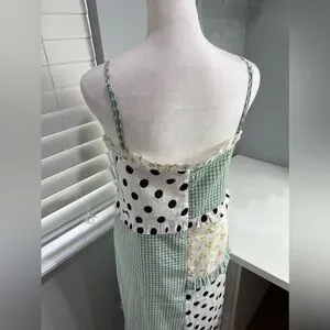 Chic patchwork maxi dress by English Factory. Features a mix of green gingham, white polka dots, and floral patterns. Spaghetti straps and a flowy silhouette.
