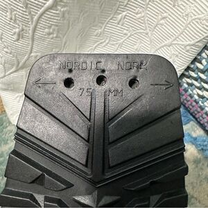 Merrell Women’s Size 6.5 Black & Blue Nordic 3 PIN Leather Cross back country Ski Boots in good preowned condition just some dents on one toe and side leather.