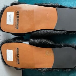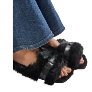 Cute flat faux fur mule with an adjustable lambskin strap. Includes shoe bags and box.