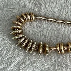 Beautiful EUC Vintage JJH for Avon rhinestone disc necklace. Classic & classy! Gold-toned serpentine chain with 20 discs in three sizes - the largest 8 are rhinestone pave discs and they plain discs graduate down in size.
