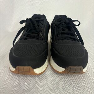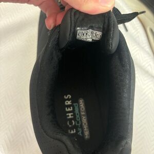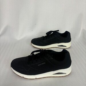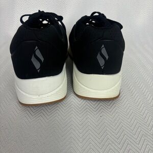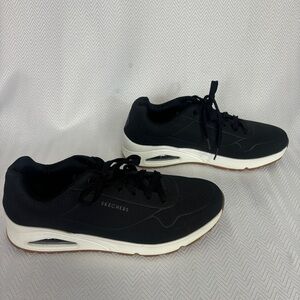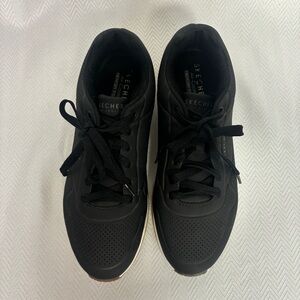 Black Skechers fashion sneaker with white soles. Air-cooled memory foam. Lace up. Perforated upper for airflow.