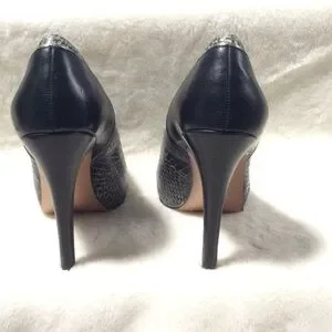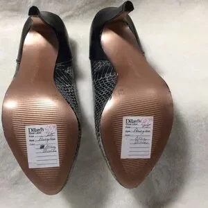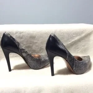 New, never worn. Faux snake skin pumps in back and gray with bronze soles inside and out. Heels measure 4 inches tall. Please note that there is a crease on the inside pad (see last picture).