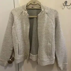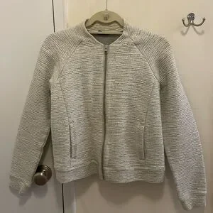 Soft bomber jacket. Two front pockets. Zip up closure. Heathered white. Shell 100% cotton. Filling 100% polyester. Lining 67% cotton, 28% polyester, 5% elastane.
