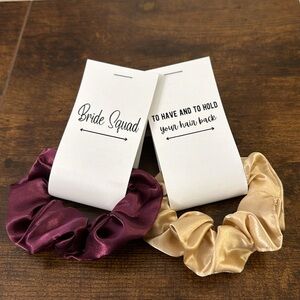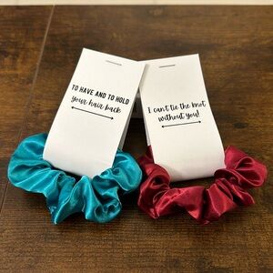 Various colors ...Let me know in Comments your choice of scrunchie colors (7) colors and (4) tag choice. Perfect for bridal shower gifts or any birthday occasion! We are smoke free home.