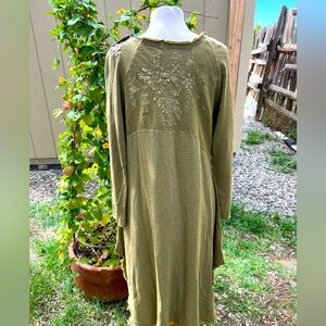 Stunning , Size small,100%cotton,Army Green Ruthy Duster. Beautiful Embroidered Back, Gauze textured bottom, tulip hem with raw edge fringe. Front hem