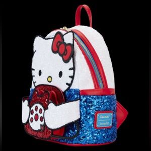 The exclusive Loungefly Sanrio Hello Kitty 50th Anniversary Sequin Phone Mini Backpack is made of vegan leather (polyurethane). Backpack has adjustable shoulder straps, sequins, side pockets, and gold-colored metal hardware. Additional features include applique, printed, real spiral cord, and embroidered details. Take note of the coordinating inside lining.