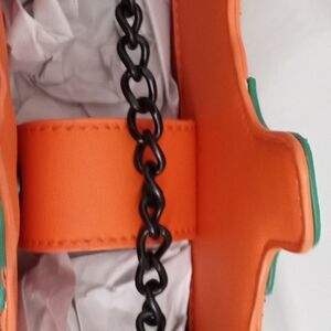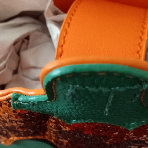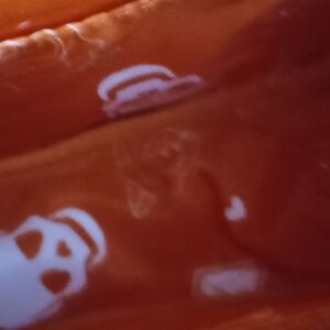 This rare gem of a bag has an orange lining accented with white skulls, triangles, and hearts.