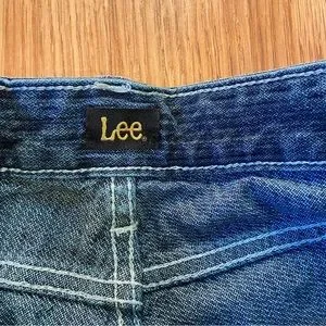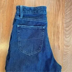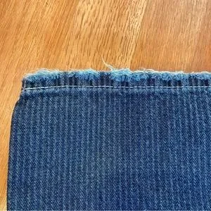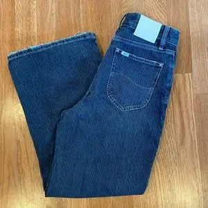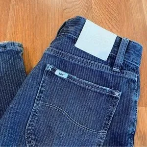 Vintage feel to these wide leg pinstripe jeans. Railroad jean, EUC, offers welcome