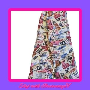 It features a ski tag print that is mostly white with pink, blue, black, and brown elements.