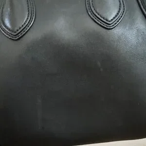 This is an authentic CELINE Smooth Calfskin Mini Luggage in Black. This stylish tote is crafted of luxuriously smooth calfskin leather in black. It features rolled leather top handles with a signature Celine scroll trim and expansive sides. The overextended zipper opens to a spacious leather interior with zipper and patch pockets. Scuffs can be seen on the exterior and interior.