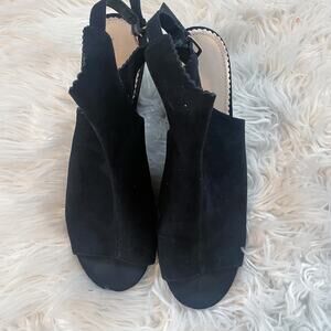Black suede slingback ankle boot. Scallop edge. Chunky 3.5" heel. Peep toe. Excellent Condition