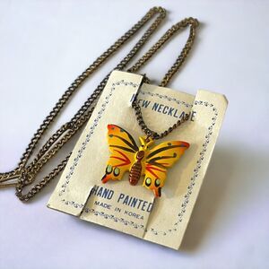 Vintage 70s Hand Painted Yellow Butterfly Necklace Made in Korea Deadstock