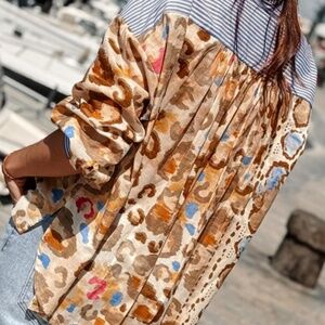 B212 Light French Beige Colorful Leopard Striped Print Patchwork V Neck Shirt