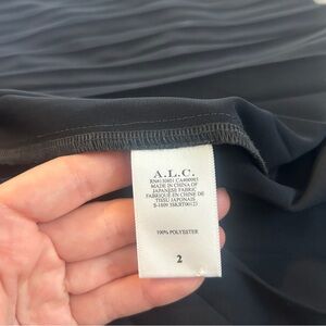 A unique addition to any woman's wardrobe, the A.L.C. Eleanor Skirt is a joy to style and wear. Coated metallic fabric creates a liquid leather effect that shines with every step thanks to the skirt's pleated midi design.100% poly. Hand wash cold. Unlined. Wrap styling with tie closure. Pleated fabric with metallic finish. Waist to shortest hem measures approx 25" and to longest hem approx 36" in length.