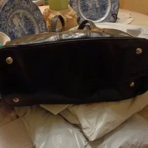 Excellent condition 14 inches across..9 inch in depth..lots of room.. lightweight bag..the snap closer the bar is curved..one small stain inside and a few loose threads on handle..see last pics..ty