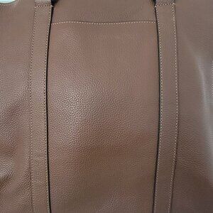 Brown Leather COACH tote with double handles (short and long) perfect for hand-held or over-the-shoulder use. With gun metal hardware. It has been kept in the dust bag and sitting upright in a closet drawer. (bag not included because if price reduction) Time for someone else to actually use it. Has inside pockets and one outside one that fits a larger smartphone perfectly. Used less than 5 times to work.