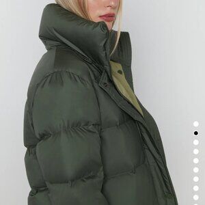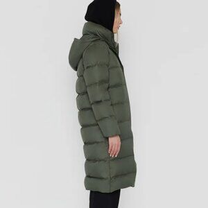 This long down filled puffer jacket is made from water resistant, recycled polyester. It has a high neckline, a front zip closure with snap buttons, side pockets and a removable hood. A must have to own this season, this puffer jacket will keep you warm in colder weather.