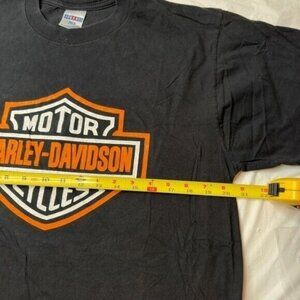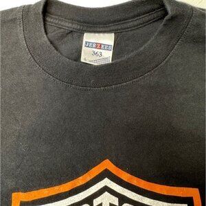This Jerzee Harley Davidson T-shirt is perfect for any motorcycle rider, featuring a graphic print with a bikercore theme. Made from machine washable cotton, this black shirt has short sleeves and a crew neckline for a comfortable fit. The double-sided design showcases a logo and color accents, while the vintage style adds a touch of grunge.