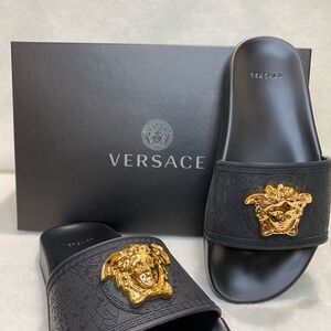 Pre-loved pool slide with 3D gold Medusa head. Classy and sophisticated bought in Nordstrom in 2021, worn once as house slippers. Comfortable & classy. Includes box & dust bags. This item is part of my private collection and has been maintained with the utmost care. I guarantee its cleanliness and excellent condition, ensuring that it meets high standards for quality. Please note that this sale is final; there are no returns, refunds, or exchanges. Thank you for understanding.