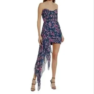 Strapless mini dress with asymmetrical draped front skirt. A dramatic trailing hem adds graceful glamour to this strapless dress that's a perfect pick for your next cocktail party.