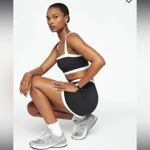 The Adelina is a two piece set with a fitted, cropped top and relaxed, mini skirt. It features wide straps for extra support and built in shorts, so you can be a little flexible. EcoMove is a sleek performance fabric with a slight sheen for mid to high-impact activities.