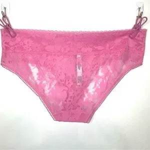Brand new never worn Victoria’s Secret hiphugger in sheer all over pink lace, size Medium.