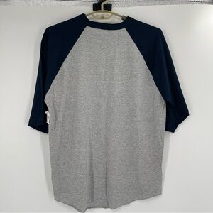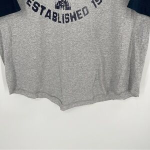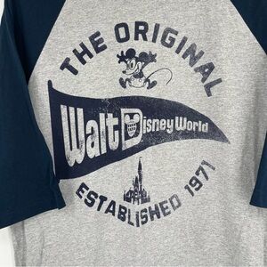 Vintage inspired graphic raglan baseball tee for adults by Disney Parks. The original Disney World Established 1971. A nostalgic graphic with the resort logo pennant, castle icon, & Mickey Mouse. Heather gray with navy sleeves and graphic. Rolled hem. 3/4 length raglan sleeves.