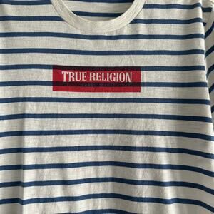 True Religion Beige Men's Blue Striped Graphic True Religion Logo t-shirt. Size Small