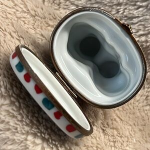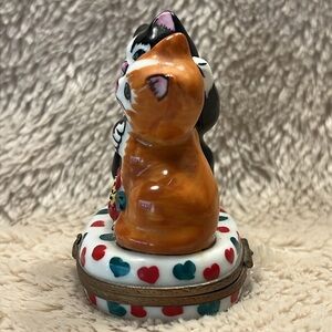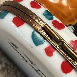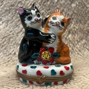 Vintage. Excellent condition. Retired. Limoges France trinket box depicts two playful cats. retired design. Cat clasp (works perfectly). Three (3) green painted hearts inside trinket. Hand painted. Handcrafted in Limoge, France. It is marked and signed with the artist's initials on the bottom. *Two pinpoint manufacturer air bubbles (see picture #7). Should you have any questions, please do not hesitate to ask. Thank you for visiting my closet. 💐