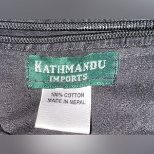 DESIGNED BY KATHMANDU!! 100% Cotton Hand-stitched Boho Sling Bag Made in Nepal. Good Condition. Inside pocket (no zipper closure), main zipper closure, pocket on strap with velcro closure. Smoke Free Home. approximately 13 1/2” X 14 1/2” X 22” strap drop.