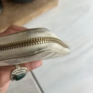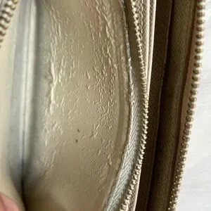 ✨Used with lots of life left: canvas patina, light color transfer in some areas, cloth parts of zipper darkened, hardware tarnish, some edge/glazing wear. Leather bubbling/peeling inside interior center zip compartment (not sticky).
