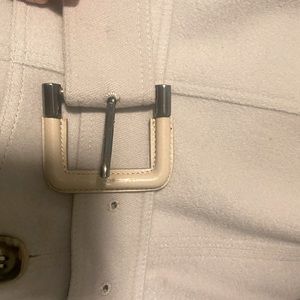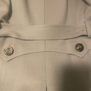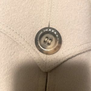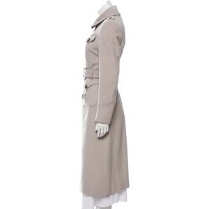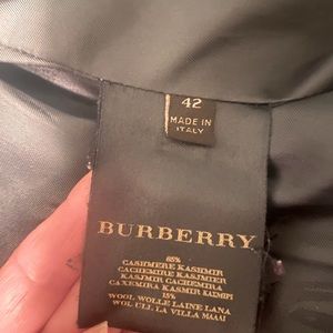 Burberry trench style cashmere-wool blend (85% Cashmere, 15% wool) coat in Dove Grey. Beautiful detailing includes flap pockets at front, peaked collar, belt closure at waist and single breasted exposed button closure at front. All of the buttons have the classic Burberry engraving and the pockets have pleats and beautiful stitching around edge as you’d expect from Burberry (hand sewn of course). Back has detail at belt that matches cuffs and pockets (see photos). Interior lining has large square Burberry label with chain and embossed Burberry horse throughout. Very good condition and was authenticated by both Poshmark and the Real Real. Two small worn areas - one at back and one on sleeve (see enlarged photos). Designer size 42 (size 8). See dimensions below: