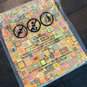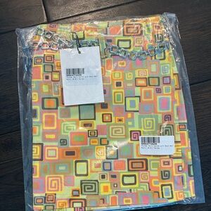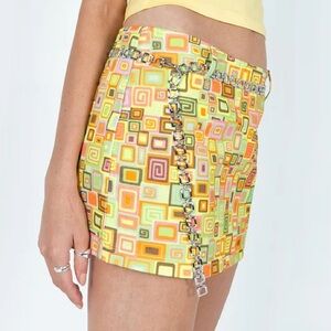 Brand new with tags The Ragged Priest “Thinker” mini skirt featuring a bold retro mod geometric print in vibrant yellow, green, pink, and orange tones. Classic 1960s/70s-inspired low-rise mini silhouette with a removable silver-tone chain belt for extra edge.