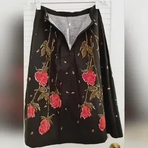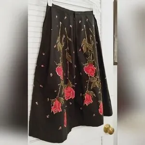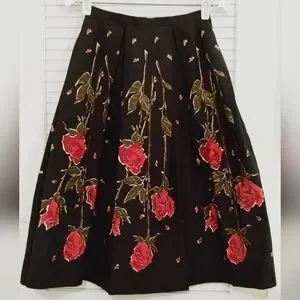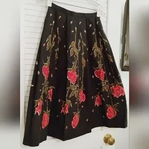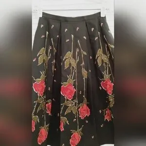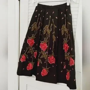 Vintage 80's Strawberry Fields Midi Floral Flair Pleated T Length Skirt. Size xs (please use measurements as no size tag). Excellent condition. Black with red rose and green petals. Pleated. Back Zip and hook closure. Midi length below knee to T Length. Flair hem. Cotton. Approximate measurements 27.375" length, 24" waist, 36" hips.