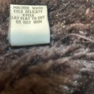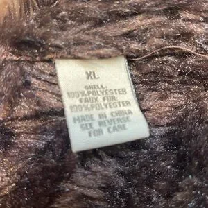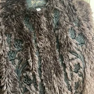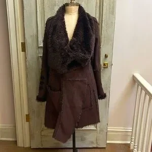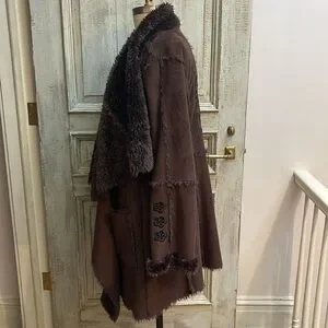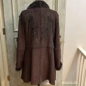 Biya for Johnny Was brown coat, front snap closure, two patch pickets, asymmetrical drape front, faux fur lining, black embroidery on sleeve & back & lining.