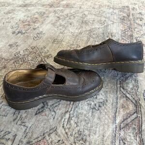 Beautiful pair of dark brown vintage Doc Martens in a UK size 8, or US women's size 10. They're a gorgeous pair of Mary Janes with wingtip details, beautiful detailing to the leather, and a buckle that works as well. Gently used, no flaws, great condition! Beautiful pair of rare "Made in England" Dr. Marten's.