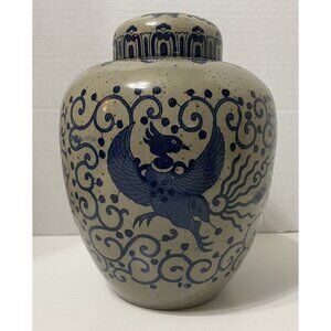 Vintage Cobalt Blue Gray Porcelain Ginger Jar Lid Phoenix Pattern 8" High