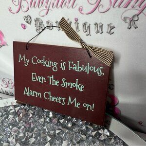 Brand new never used no tag. Very cute kitchen decor. My cooking is fabulous even the smoke alarm Cheers me on. π€£ haha! It has a cute ribbon π plaid bow. So cute. Red maroon wine color. With blue writing. Metal hanging portion. Also have a matching one in our shop for sale. Check it out! βΊοΈ