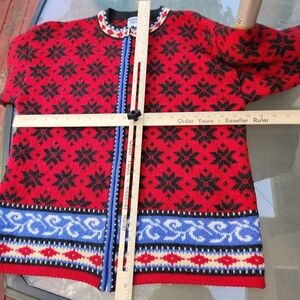 Vintage Rugged Bear Cardigan Women’s Small Red Blue Wool Nordic Zipper